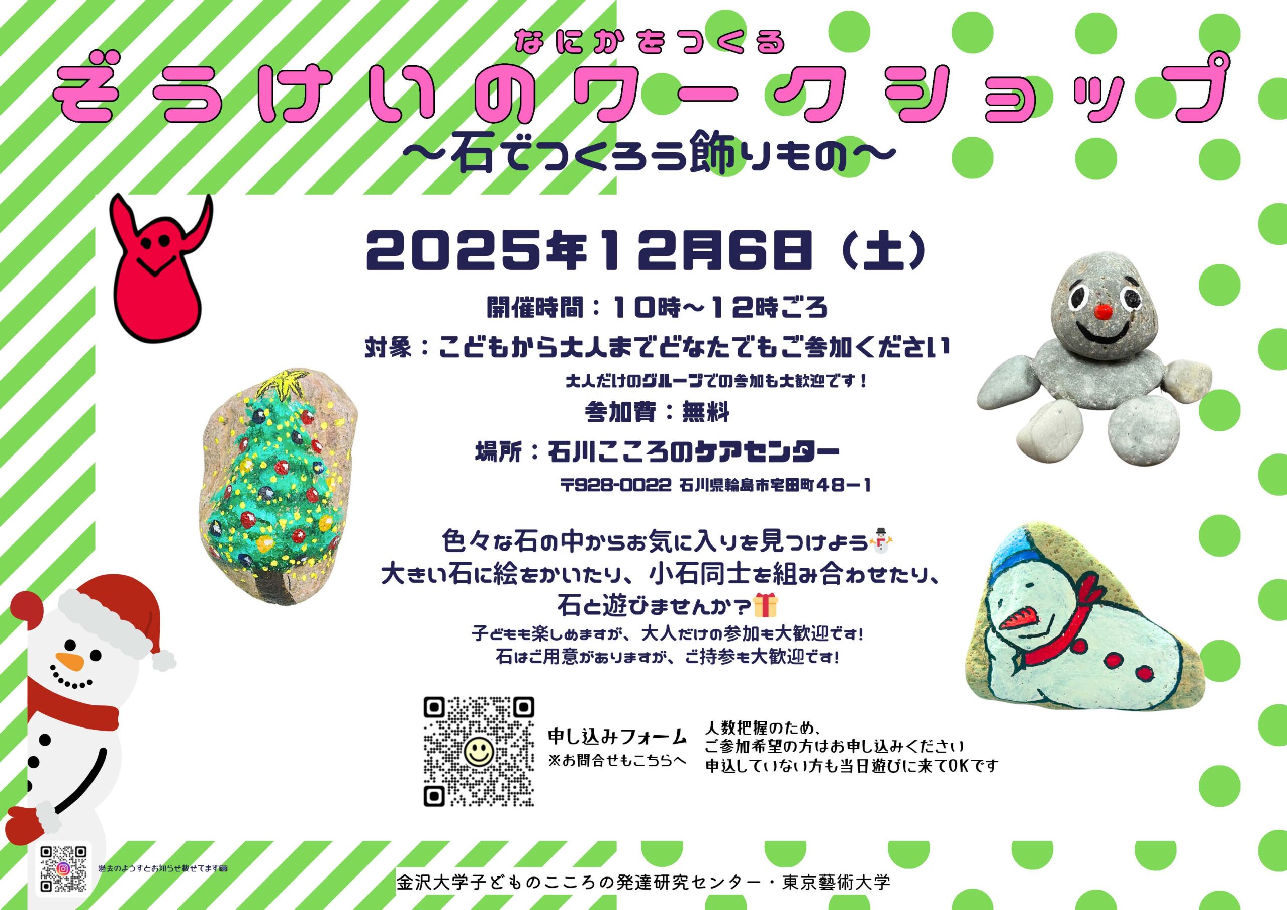 12/6(土)「なにかをつくる ぞうけいのワークショップ ~石でつくろう飾りもの~」が当センターで開催されます。金沢大学子どものこころの発達研究センターと東京藝術大学による企画です。こどもから大人まで、どなたでもどうぞご参加ください。