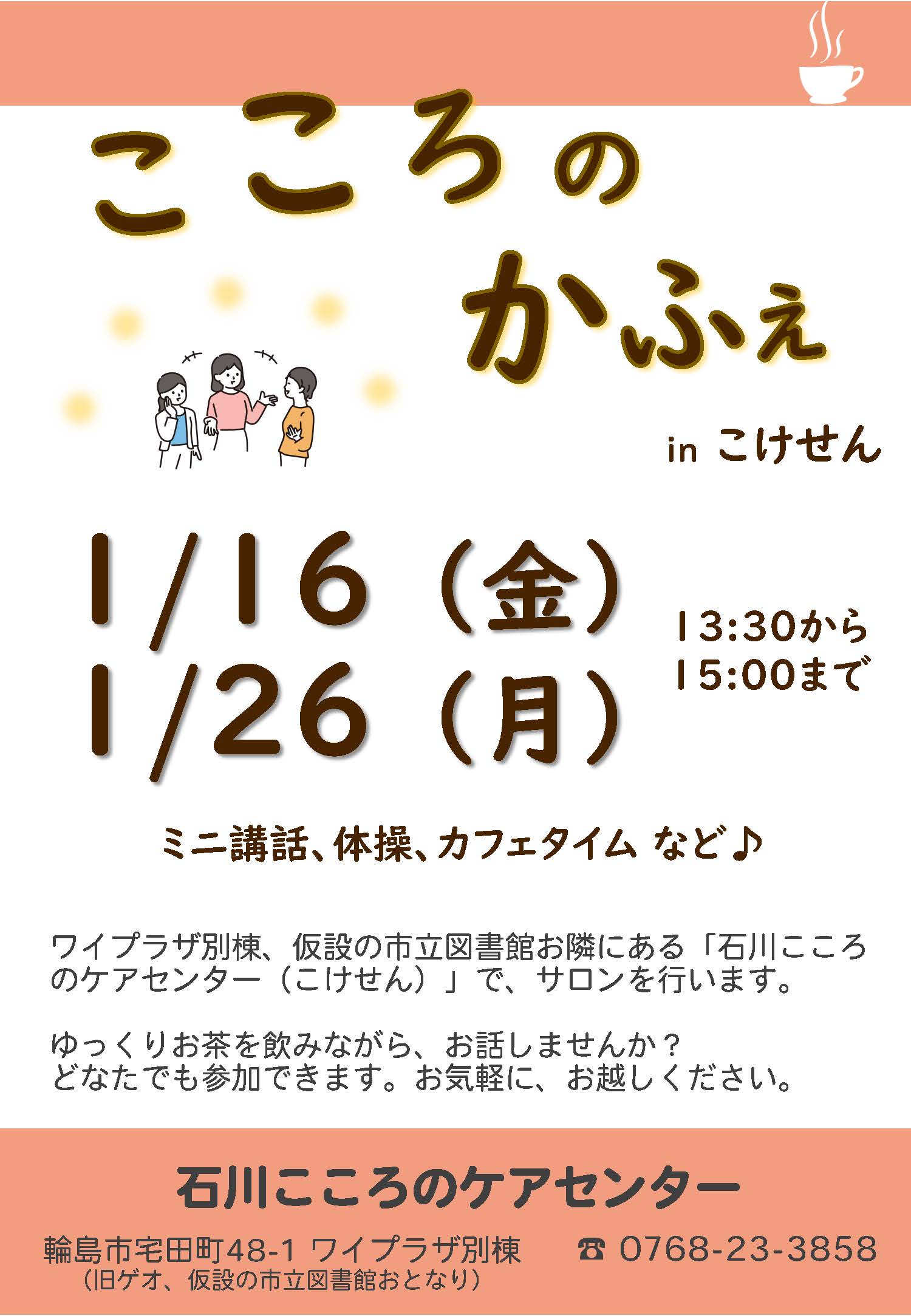 当センターでは月に2回、サロン「こころのかふぇ」を開催しています。2026年1月は16日(金)と26日(月)に行います。どなたでも参加できます。どうぞお立ち寄りください。