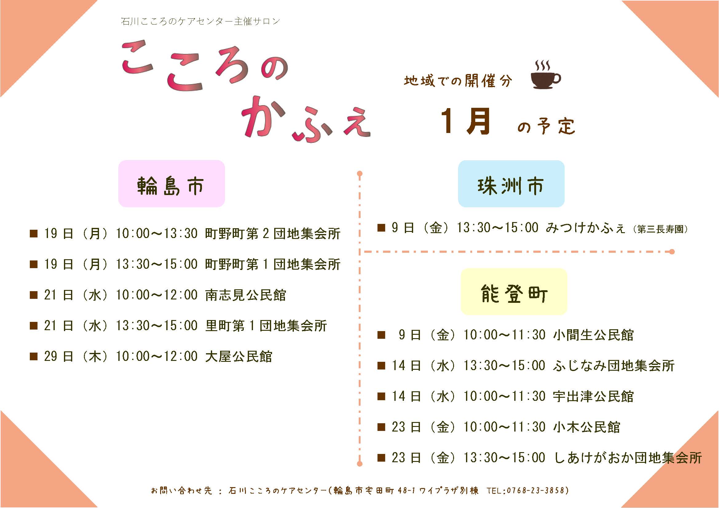 サロン「こころのかふぇ」は石川こころのケアセンター内だけでなく、地域でも行っています。2026年1月は輪島市、珠洲市、能登町で予定しています。どうぞご参加ください。