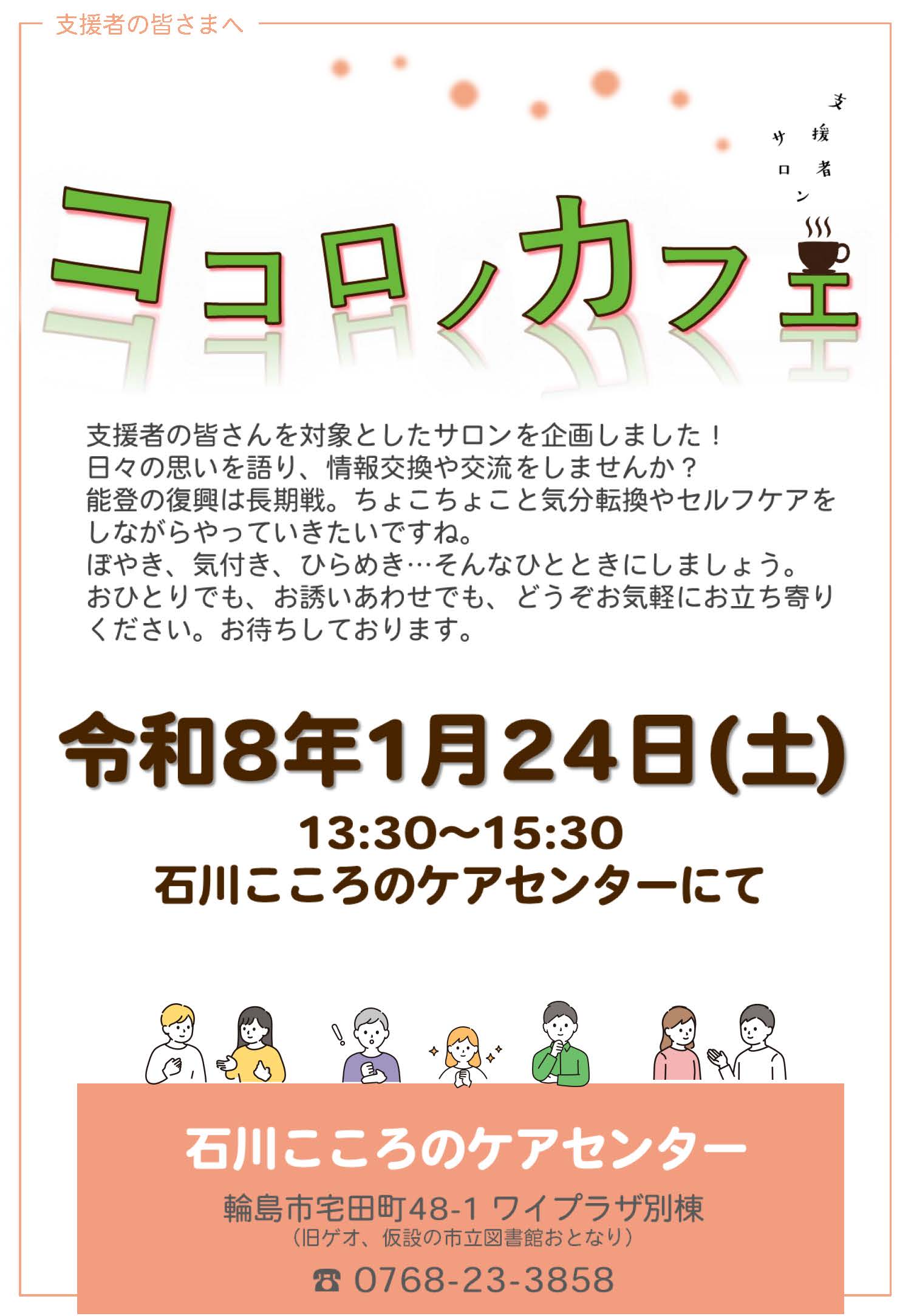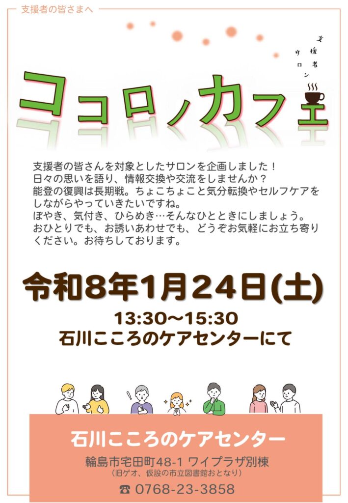 支援者サロン「ココロノカフェ」のご案内 支援者サロン「ココロノカフェ」 2026.01.05 支援者の皆さんを対象としたサロンを企画しました。日々の思いを語り、情報交換や交流をしませんか?どうぞご参加ください。