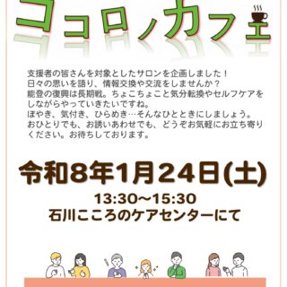 1/24(土)に予定していました支援者サロン「ココロノカフェ」は、悪天候が予想されるため中止とさせいただきます。