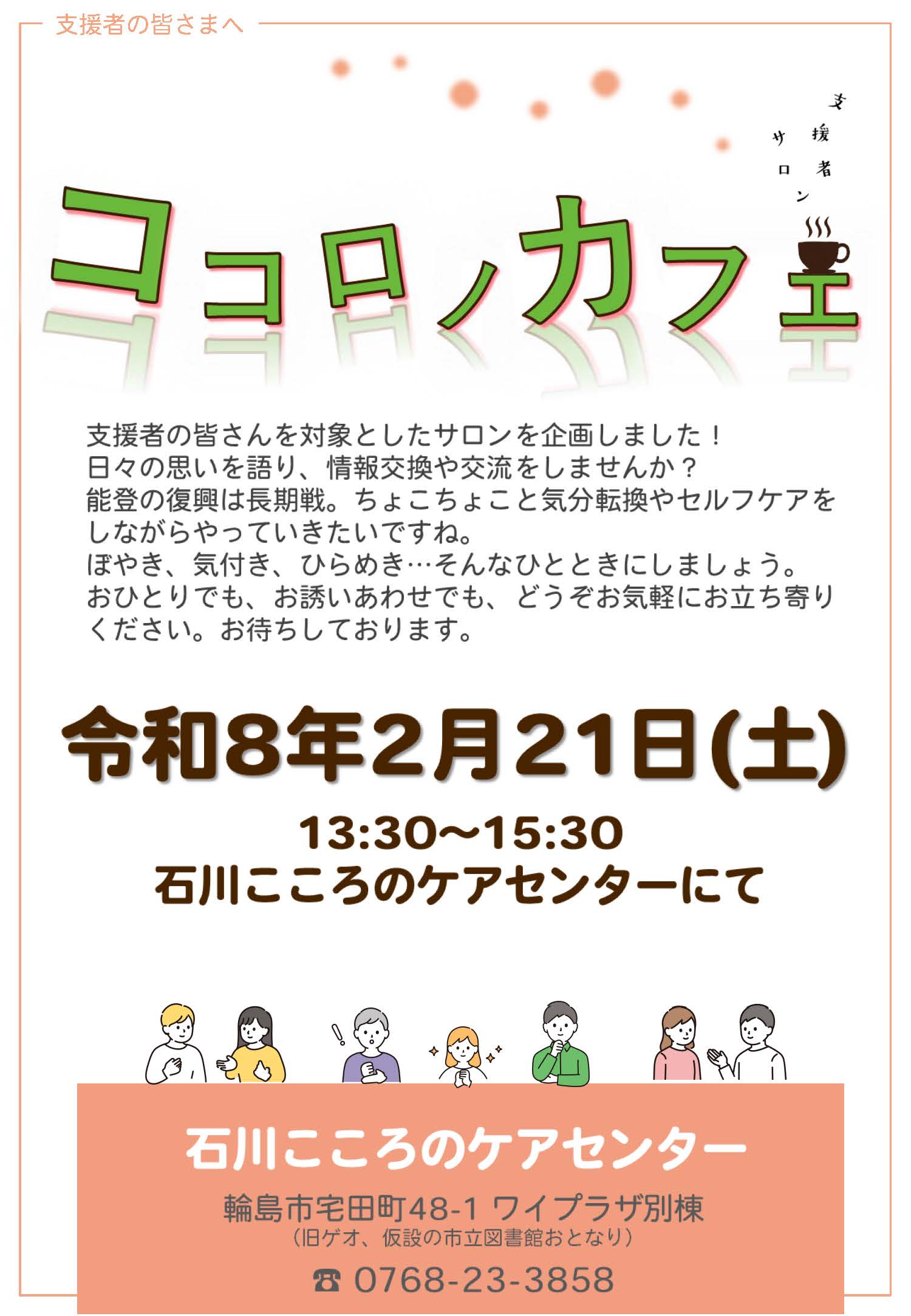 支援者サロン「ココロノカフェ」のご案内 支援者サロン「ココロノカフェ」 2026.01.28 支援者の皆さんを対象としたサロンを企画しました。日々の多いを語り、情報交換や交流をしませんか?どうぞご参加ください。
