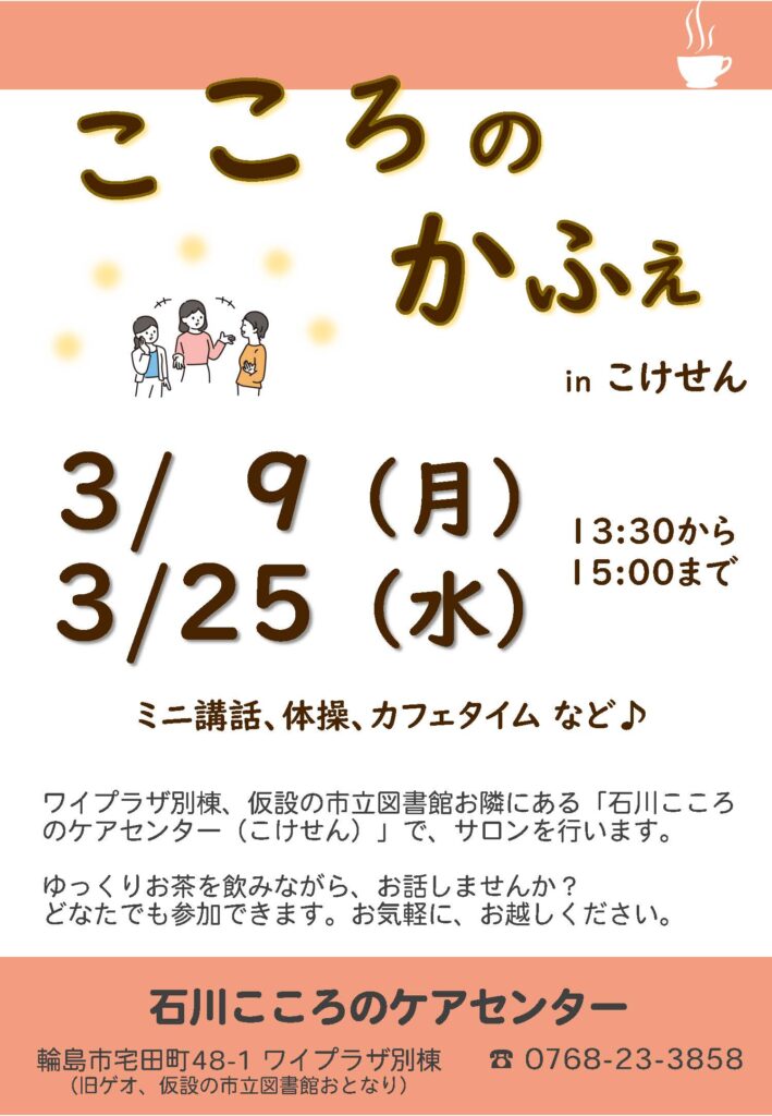 サロン「こころのかふぇ」3月のご案内 サロン「こころのかふぇ」 2026.03.02 当センターでは月に2回、サロン「こころのかふぇ」を開催しています。3月は9日(月)と25日(水)に行います。どなたでも参加できます。どうぞお立ち寄りください。